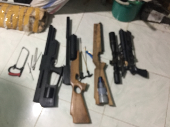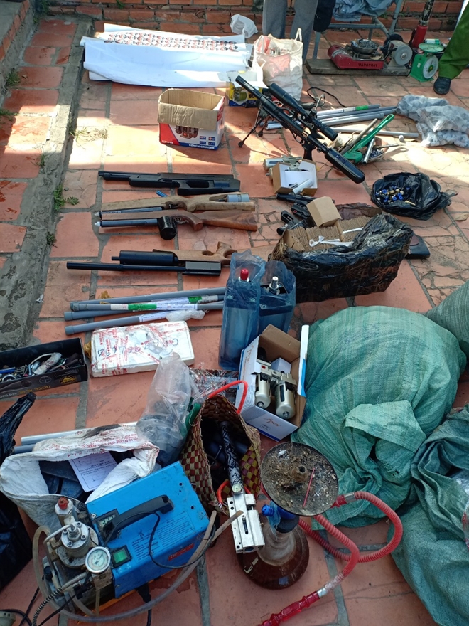 Tại hiện trường, cơ quan Công an thu giữ máy dập đạn chì, máy cắt kim loại, máy bơm hơi, máy hàn, 3 khẩu súng tự chế, 5 bộ khuôn dập đạn, 41 đồng hồ đo áp suất, 34 ống búa súng, 97 ống kim loại làm nòng súng, 5 ống hơn và 16 miếng chì.