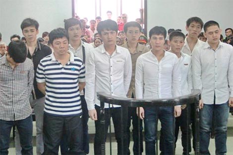 | Bị cáo Nguyễn Hữu Hạnh (áo thun sọc ngang) và 9 đồng phạm tại phiên xử sơ thẩm. |