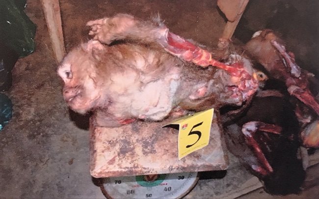 5 cá thể động vật được tổ công tác phát hiện cất giấu trong tủ lạnh của cơ sở kinh doanh trên có 1 cá thể là loài Voọc chà vá chân đen và 4 cá thể là loài khỉ đuôi lợn (có tên khoa học Macaca leonina), thuộc danh mục động vật rừng nguy cấp, quý, hiếm.