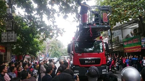Sau khi nhận được tin báo, Cảnh sát PCCC quận Hoàng Mai đã huy động xe thang cùng cả chục Cảnh sát tới hiện trường đặt phao hơi phía dưới nhưng anh này không hợp tác.