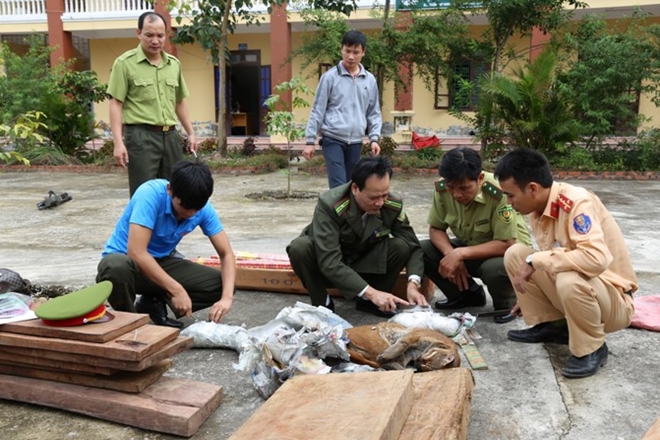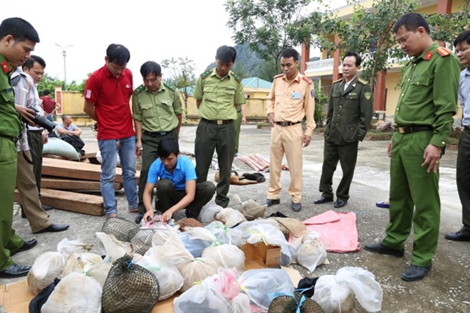Vào thời điểm kiểm tra, tổ công tác thấy trên nóc xe chứa số lượng lớn cá thể tê tê, rùa đầu to, báo lửa, tay gấu, gỗ Hương, pháo… Kiểm đếm trên xe, cơ quan chức năng thống kê có 22 tay gấu có trọng lượng 50kg; 69 cá thể rùa đầu to (trọng lượng 32,5kg); 32 cá thể tê tê (trọng lượng 128kg); 5kg vẩy tê tê; 1 cá thể báo lửa (đã chết, trọng lượng 12kg); 30kg pháo cây và 1,471m3 gỗ Hương.