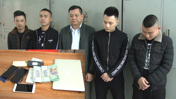 | Các đối tượng và tang vật trong vụ đánh bạc. |