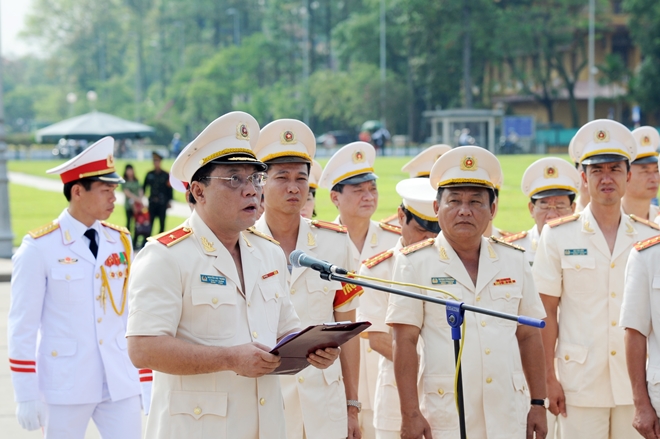 Trước Anh linh Chủ tịch Hồ Chí Minh, Đoàn đại biểu đã bày tỏ lòng thành kính, lòng biết ơn vô hạn với Bác Hồ, người sáng lập và rèn luyện Đảng ta cũng như công lao to lớn của Người đối với sự nghiệp cách mạng vẻ vang của Đảng và dân tộc ta, đồng thời xin hứa: Tuyệt đối trung thành với sự nghiệp cách mạng của Đảng; kiên định mục tiêu lý tưởng xã hội chủ nghĩa mà Tổ quốc, Đảng và nhân dân ta đã lựa chọn; nêu cao bản lĩnh chính trị, tinh thần cảnh giác cách mạng; sẵn sàng chiến đấu hy sinh vì nền an ninh trật tự của Tổ quốc, vì cuộc sống bình yên và hạnh phúc của nhân dân.Đổi mới mạnh mẽ nội dung, hình thức, phương pháp công tác tư tưởng theo hướng gắn với thực tiễn, với cơ sở nhằm nâng cao bản lĩnh chính trị, lòng trung thành tuyệt đối của cán bộ, chiến sĩ Công an với Đảng, Nhà nước và nhân dân; lấy nền tảng tư tưởng Chủ nghĩa Mác Lênin, tư tưởng Hồ Chí Minh, Sáu điều Bác Hồ dạy CAND, quan điểm, chủ trương đường lối lãnh đạo của Đảng, Hiến pháp, pháp luật của Nhà nước làm phương châm, nguyên tắc, căn cứ triển khai các hoạt động của lực lượng Công an.