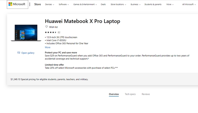 | Mẫu máy tính xách tay của Huawei trở lại với trang bán lẻ của Microsoft. |