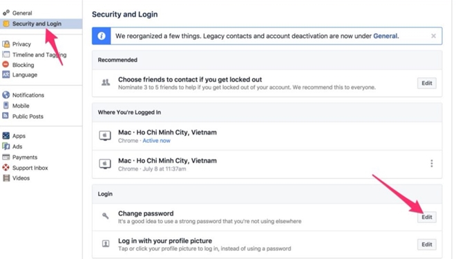 Việc đầu tiên mà người dùng Facebook cần thực hiện ngay sau sự cố trên đó là thay đổi lại mật khẩu tài khoản của mình bằng cách truy cập vào mục Settings (Cài đặt) chọn Security and Login (Bảo mật và Đăng nhập), sau đó chọn Change Password (Đổi mật khẩu) để tiến hành thay đổi mật khẩu mới.