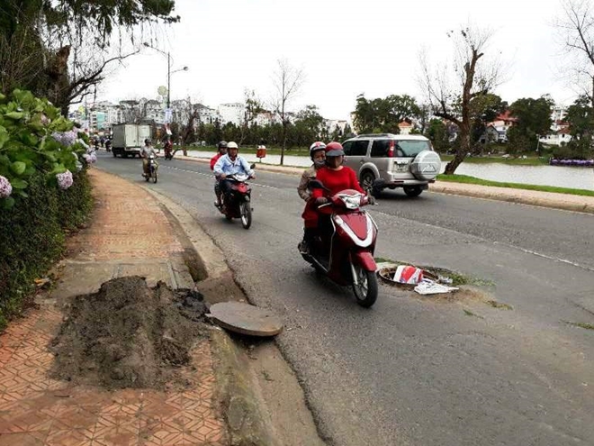 Rất nhiều nắp cống cao hơn mặt đường tới 10cm, thậm chí còn có những hố ga không được che đậy hoặc lắp đặt biển báo cho người đi đường biết.