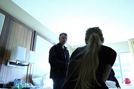 | Một nghi can nữ bị đặc vụ FBI thẩm vấn tại phòng khách sạn trong chiến dịch trấn áp nạn buôn bán nô lệ tình dục. |
