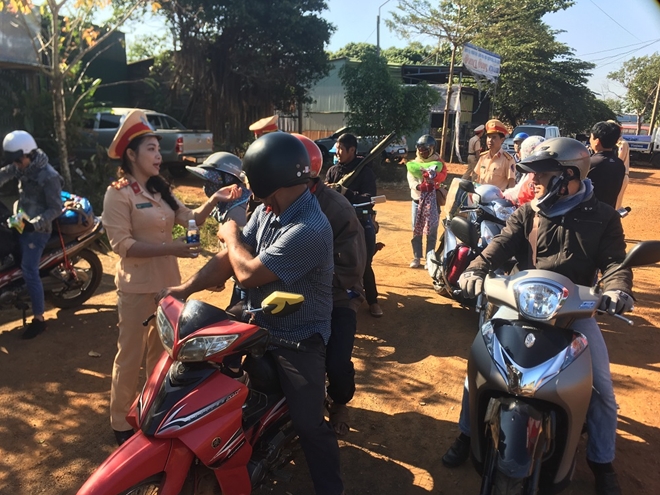 | CSGT Công an Đắk Nông tặng nước uống, khăn lạnh cho người dân trên đường về quê ăn Tết. |