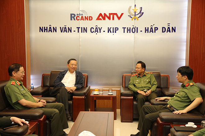 | Bộ trưởng Tô Lâm và lãnh đạo Cục Truyền thông CAND tại buổi làm việc. |