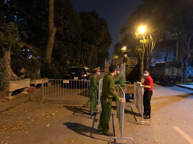 | Công an phường Hoàng Liệt thực hiện nhiệm vụ tại một chốt cách ly. |