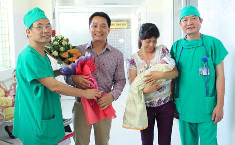 | Các bác sĩ chúc mừng gia đình sản phụ Vũ Thị Thanh Ngọc. |