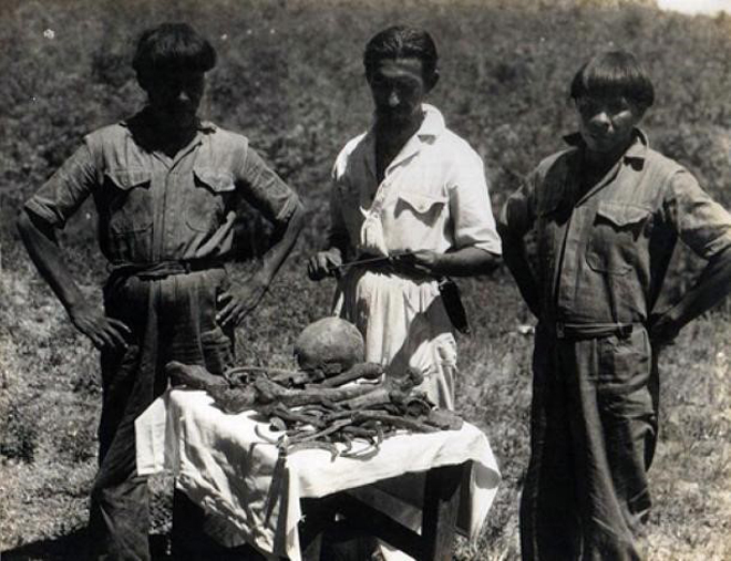 Orlando Villas Boas với 2 người da đỏ Kalapalo và những mẩu xương được cho là của Đại tá Fawcett, năm 1952 |