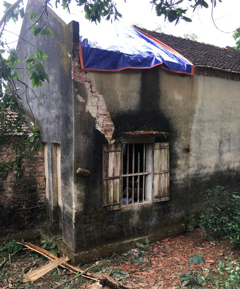 Phía bên hiên nhà, sát với buồng ngủ của vợ chồng anh Bằng, chị Thu là cây keo có tuổi thọ hàng chục năm bị sét đánh xẻ dọc thân, đánh sập ngọn, thậm chí vết sét đánh lớn đến mức cày xới nền đất từ gốc cây chạy sát tường nhà. Tường ngoài buồng ngủ cũng có hàng chục vết nứt kéo dài từ trên mái xuống tới tận nền nhà.