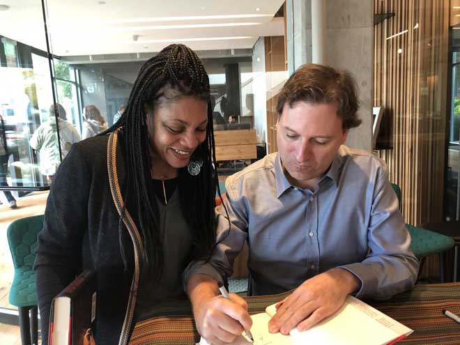 | John Carreyrou ký tặng sách cho độc giả. Ảnh đăng trên Twitter. |