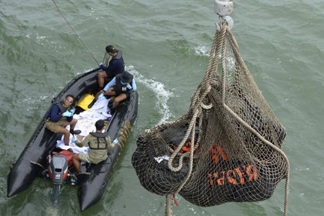 | Thợ lặn Indonesia tham gia quá trình tìm kiếm thi thể nạn nhân của máy bay QZ8501. Gần đó một số thi thể nạn nhân đang được cẩu lên tàu Hải quân Indonesia KRI Banda Aceh, ngày 3/1/2015. |