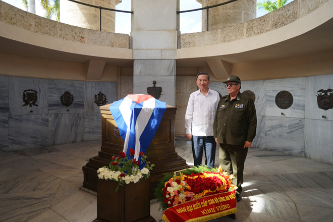 Vào trước đó, Bộ trưởng Tô Lâm và đoàn đại biểu cấp cao Bộ Công an Việt Nam đã tới Santiago de Cuba đặt hoa viếng Anh hùng dân tộc Cuba Jose Marti và lãnh tụ Fidel Castro tại nghĩa trang Santa Ifigenia.