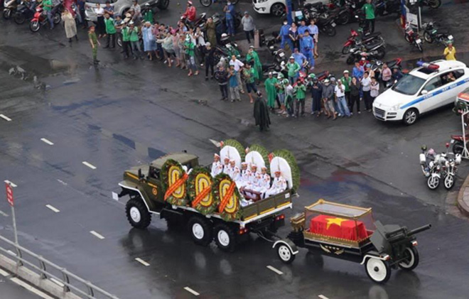 Dù trước đó trời mưa lớn, nhưng trên các tuyến đường như Trường Sơn, Hoàng Văn Thụ, Nguyễn Văn Trỗi, Nam Kỳ Khởi Nghĩa, Điện Biên Phủ… đã có rất đông người dân đứng ven đường từ sớm; nhiều người đã mang theo di ảnh của ông đội mưa chờ đợi giây phút đoàn linh xa đi qua để được tiễn biệt ông về với đất mẹ.