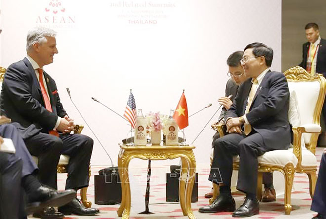| Phó Thủ tướng, Bộ trưởng Bộ Ngoại giao Phạm Bình Minh và Cố vấn An ninh Quốc gia Robert Charles O'Brien. Ảnh: TTXVN |