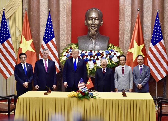 | Tổng Bí thư - Chủ tịch nước Việt Nam Nguyễn Phú Trọng và Tổng thống Mỹ Donald Trump chứng kiến Lễ ký kết mua 10 máy bay Boeing 787-9 Dreamliner của Bamboo Airways |