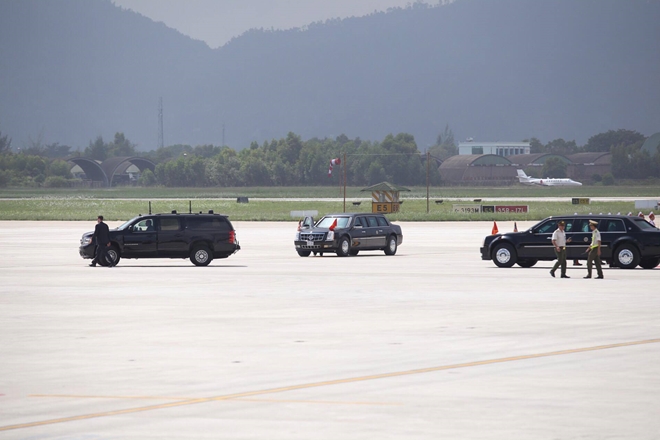 | Dàn siêu xe hộ tống Tổng thống Mỹ có mặt tại sân bay gần nửa tiếng trước khi chiếc Không lực 1 hạ cánh. |
