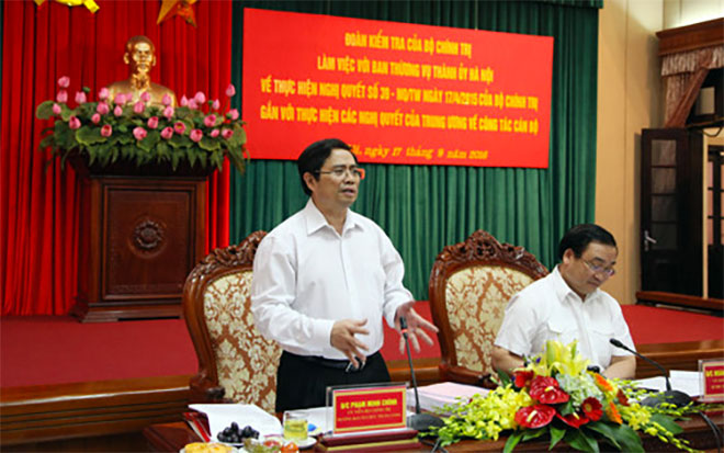 Chiều nay (17/9), Đoàn kiểm tra của Bộ Chính trị do Ủy viên Bộ Chính trị, Trưởng ban Tổ chức Trung ương Phạm Minh Chính làm Trưởng đoàn làm việc với Ban Thường vụ Thành ủy Hà Nội về thực hiện Nghị quyết số 39 của Bộ chính trị về tinh giản biên chế và cơ cấu lại đội ngũ cán bộ, công chức, viên chức gắn với việc thực hiện các Nghị quyết của Trung ương về công tác cán bộ. Về phía Thành ủy Hà Nội, tham dự có Ủy viên Bộ Chính trị, Bí thư Thành ủy Hoàng Trung Hải và các đồng chí trong Ban Thường vụ.