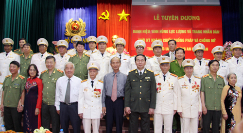 | Bộ trưởng Trần Đại Quang cùng các đồng chí lãnh đạo Bộ Công an và đại diện tập thể, cá nhân được phong tặng, truy tặng danh hiệu Anh hùng LLVTND thời kỳ kháng chiến chống Pháp và chống Mỹ. (TP Hồ Chí Minh ngày 18/4, ảnh: Đức Thắng). |