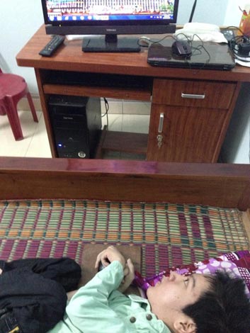 | Vũ Đức Nguyên nằm rê chuột dùng bàn phím ảo làm thơ, lướt nét. |