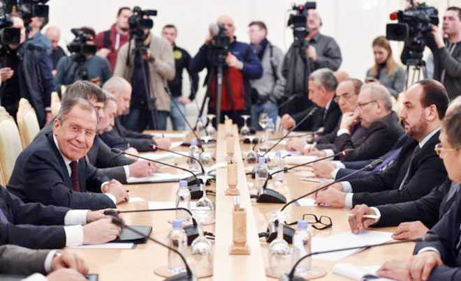| Ngoại trưởng Nga Sergei Lavrov và Trưởng đoàn đàm phán đại diện cho phe đối lập Syria Nasr Al-Hariri trong cuộc gặp tại Moscow ngày 22-1. |