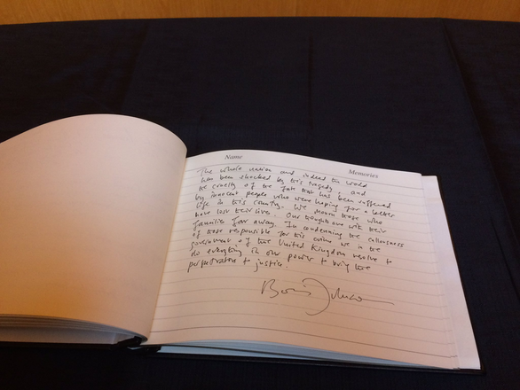 | Thủ tướng Anh ghi sổ tang các nạn nhân. Ảnh: ITN |