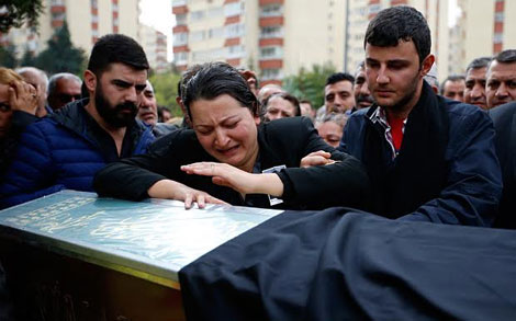 | Người dân Thổ Nhĩ Kỳ đau đớn tiễn biệt thân dân bị thiệt mạng trong vụ tấn công. |