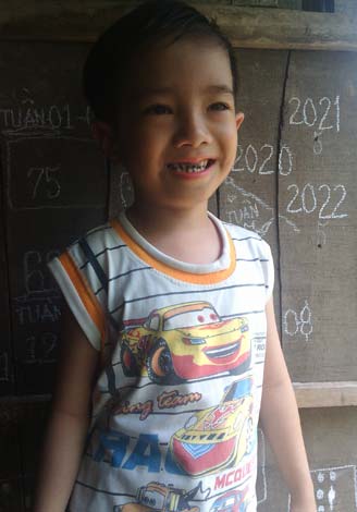 Điều đầu tiên đập vào mắt chúng tôi là bốn bức vách bằng gỗ chi chít con số với nét viết ngay ngắn, tròn trĩnh. Chỉ tay lên bức tường, anh Chửng nói: "Đấy là chữ Hiếu Ân viết. Thằng bé ham viết, bốn bức tường giờ chẳng còn chỗ nào hở nữa". Nghe ba nhắc đến tên, bé Ân chạy ra sà vào lòng cha, mắt sáng long lanh.