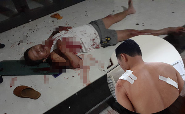 | Ông Qua bị chém nhiều nhát gây thương tích nặng; Anh Quang bị chém ở phần lưng (ảnh nhỏ). |