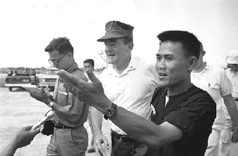 | Một chỉ huy “xây dựng nông thôn” đang hướng dẫn quan thầy Mỹ đi thăm trung tâm huấn luyện. |