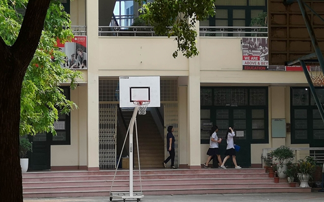 | Khu vực trước cổng trường Nguyễn Tất Thành được ngăn khu vực cấm để hạn chế người qua lại, tránh làm ảnh hưởng đến quá trình làm bài của các em. |