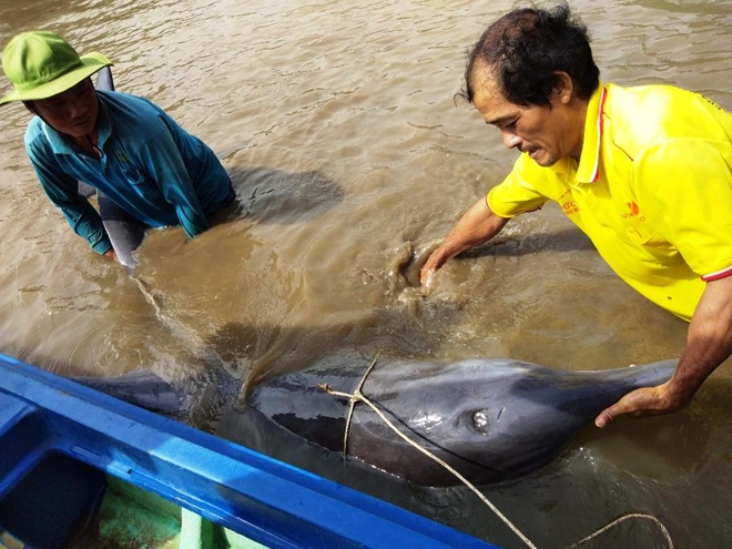 Ông Nguyễn Văn Bờ, người trực tiếp cứu cá heo cho biết thêm, con cá heo nặng khoảng 150kg dài hơn 2 mét bị mắc cạn vào bờ trong tình trạng rất yếu, may được cứu kịp thời nên cá heo vẫn sống và bơi ra biển. Đây là lần đầu tiên cá heo xuất hiện ở vùng biển này.