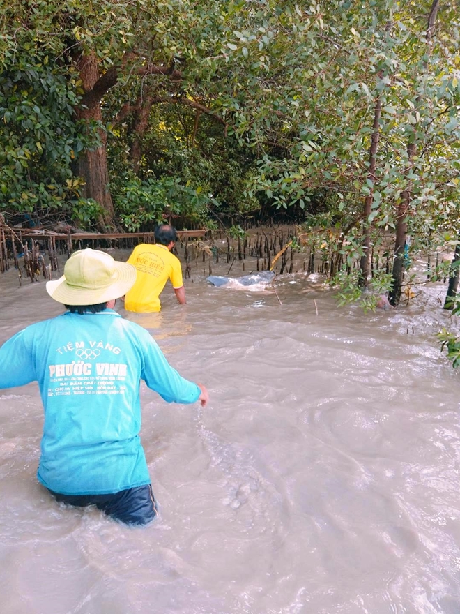 | Ông Nguyễn Văn Bờ (chồng chị Bé mặc áo vàng) cùng người dân kéo cá heo bị mắc cạn ra ngoài biển. |