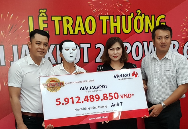 | Người đàn ông may mắn ở Vĩnh Long, đeo mặt nạ nhận giải thưởng Jackpot 2 gần 6 tỷ đồng. |