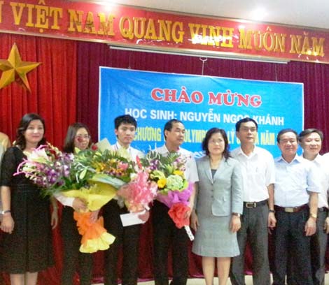 | Sở GD&ĐT Nghệ An cùng các thầy, trò Trường chuyên Phan Bội Châu vui mừng đón Nguyễn Ngọc Khánh (thứ ba từ trái sang). |