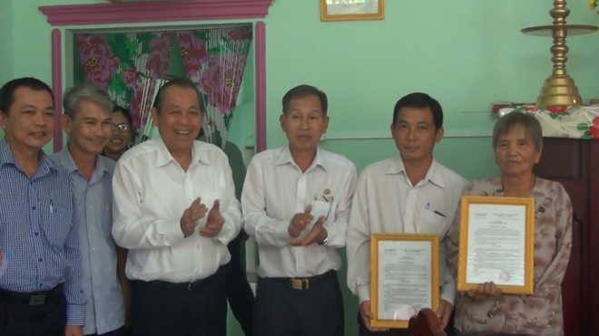 | Đồng chí Trương Hoà Bình trao quyết định nhà tình nghĩa cho gia đình bà Châu Thị Thơi và gia đình ông Bùi Thanh Bình. |