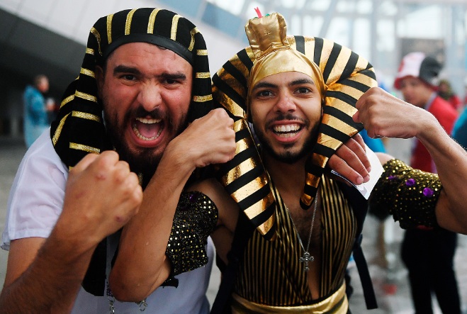 | Hai Pharaohs trên đường phố St. Petersburg. Họ chắc chắn sẽ rất buồn khi đội tuyển Bắc Phi nhận thất bại thứ 2, sẽ phải rời khởi World Cup sau khi vòng bảng kết thúc. Ảnh: Sputnik. |