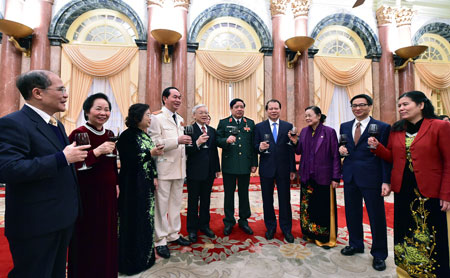 | Tổng Bí thư Nguyễn Phú Trọng và lãnh đạo Đảng, Nhà nước, lãnh đạo các Bộ, ngành tại buổi gặp mặt sáng 14/2. ảnh VGP. |