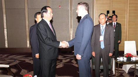 | Bộ trưởng Trần Đại Quang trao đổi các Trưởng đoàn quốc tế tham dự Hội nghị. Ảnh Việt Hưng. |