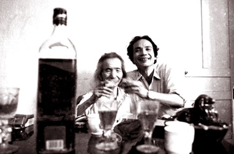 | Nhạc sĩ Trịnh Công Sơn uống rượu cùng với nhà văn Nguyễn Quang Sáng. |