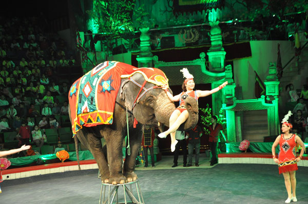 | Chương trình biểu diễn xiếc voi của Liên đoàn Xiếc Việt Nam trưa 15-3 khiến đông đảo khán giả nhí phấn khích. |