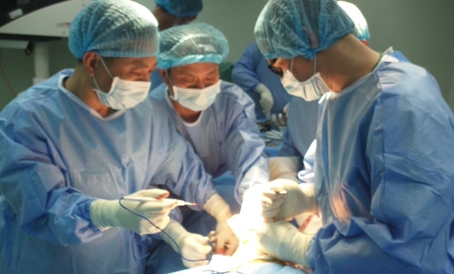 | Các bác sĩ đang phẫu thuật thay khớp háng cho cụ Mười. |